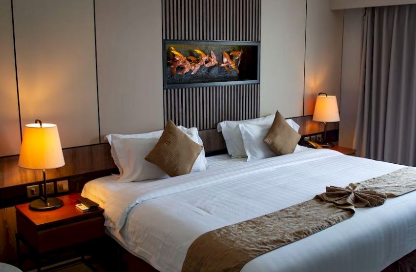 • The image shows a hotel room with a large bed, decorative pillows, bedside lamps, and a small table, creating a cozy atmosphere.