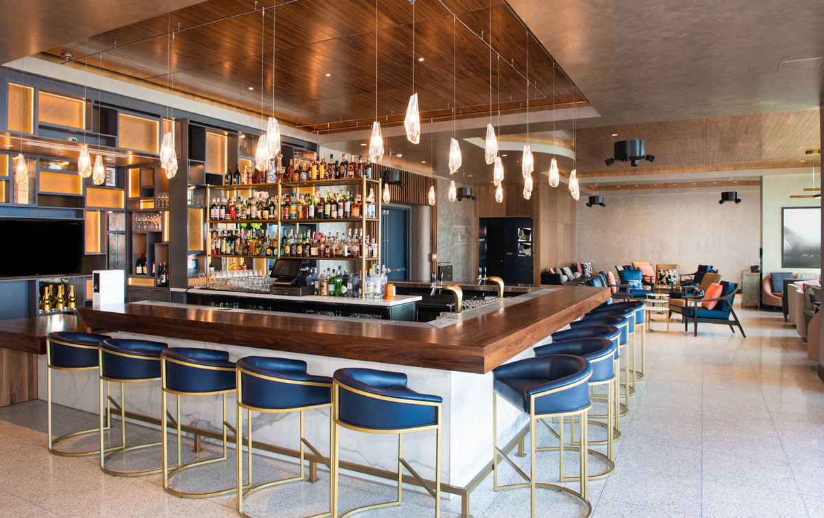 The image shows a modern bar with a wooden counter, blue barstools, and a variety of bottles. Hanging lights and seating are visible.