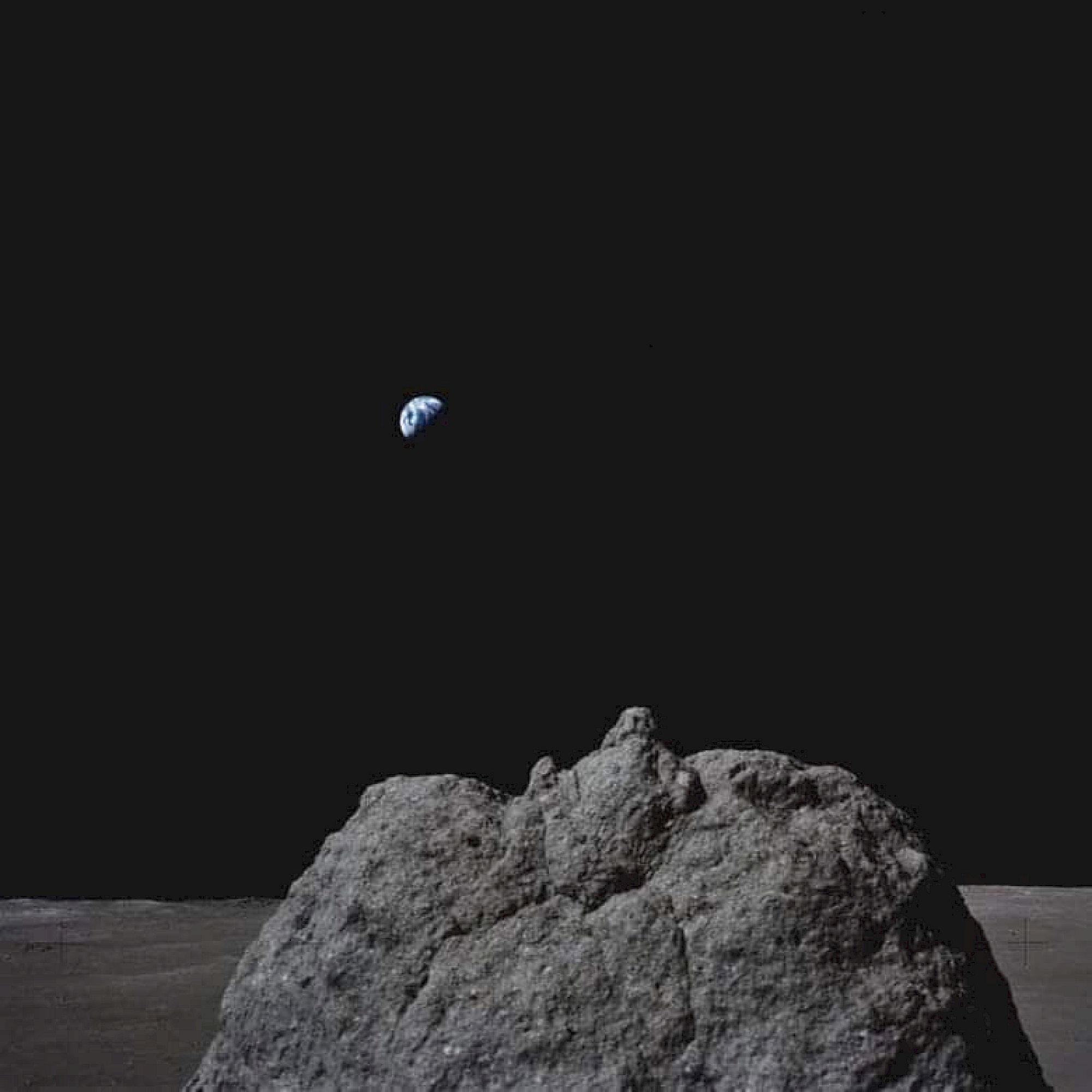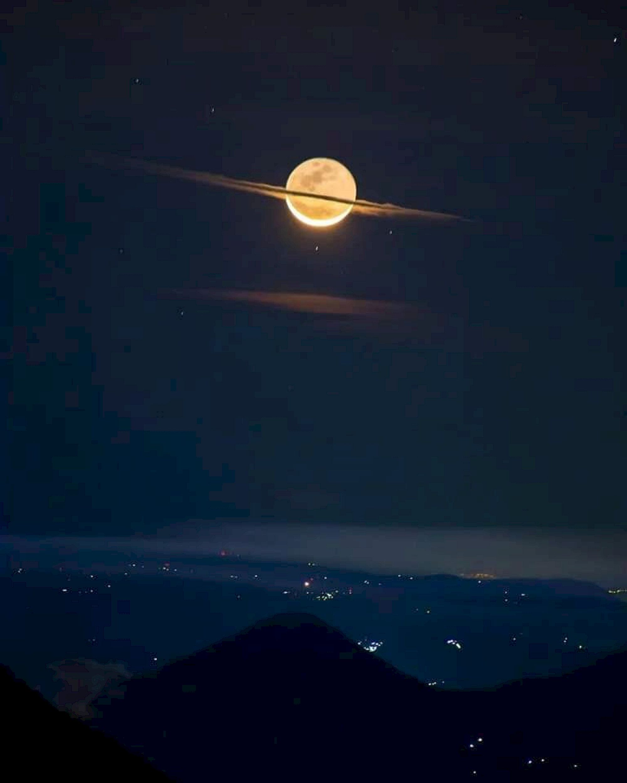 A starry night sky over a mountainous landscape with a prominent peak and distant horizon glow, under a cool blue atmosphere.