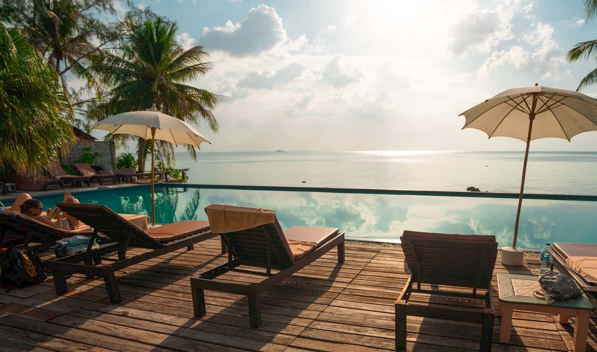 A serene poolside setting with lounge chairs, umbrellas, and a beautiful view of the ocean under a partly cloudy sky.