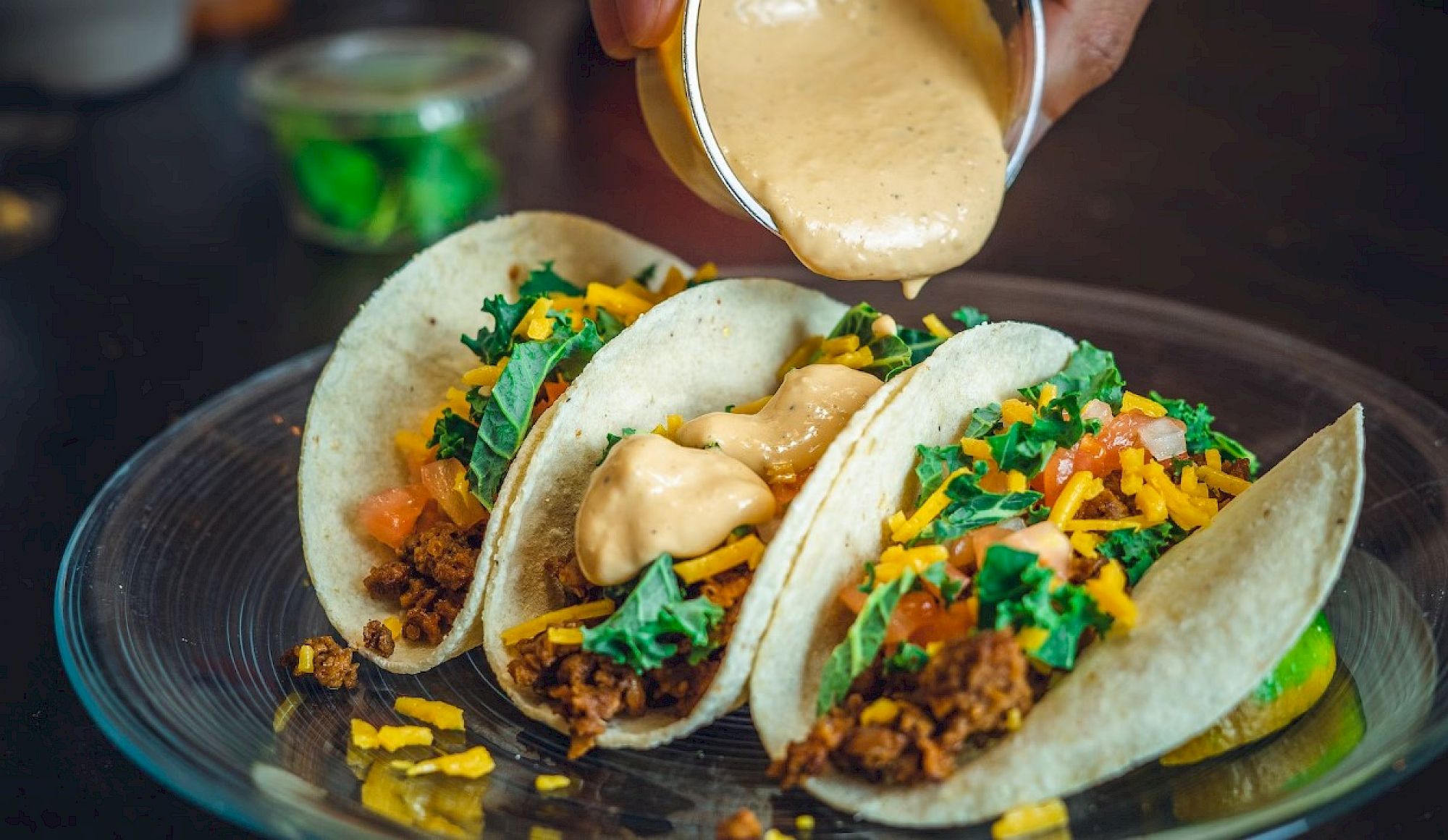 Three tacos filled with ground meat, cheese, lettuce, and tomatoes on a plate, with sauce being poured over them.
