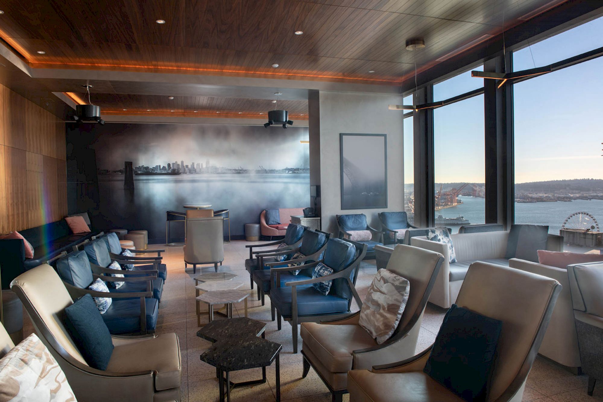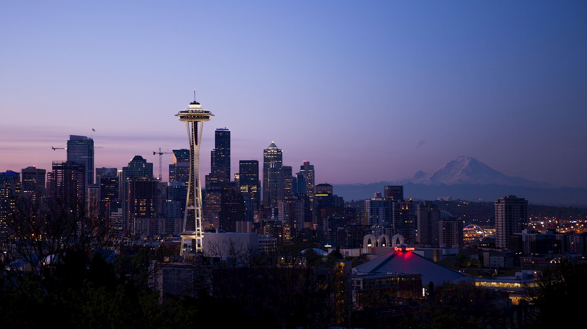 A city skyline at dusk with a prominent tower and mountain in the background, likely Seattle with Mount Rainier visible.